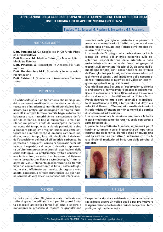 Authors: Dr. Patalano M. G.: Specialist in Plastic and Recon-structive Surgery Dr. Boccacci M.: Surgeon –Master Degree in Aesthetic Medicine Dr. Patalano G.: Specialist in Anaesthesiology Dr. Bombardiere M.T.: Specialist in Anaesthesiology Dr. Patalano I.: Specialist in Anaesthesiology